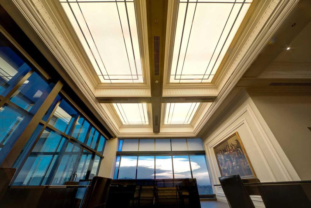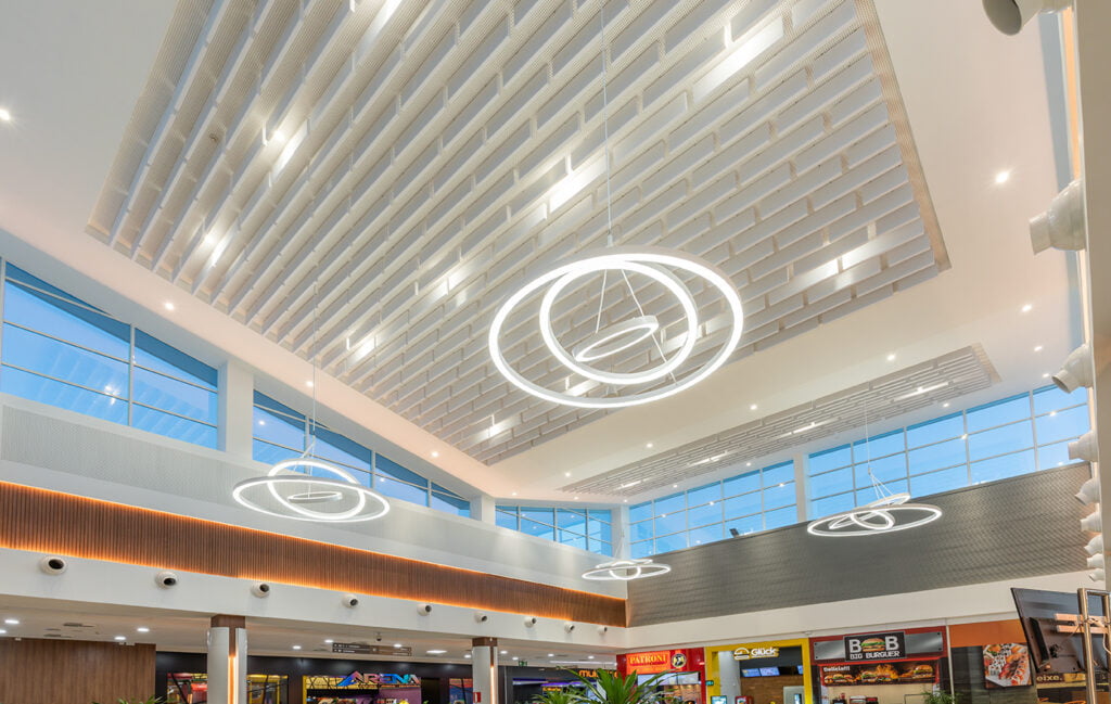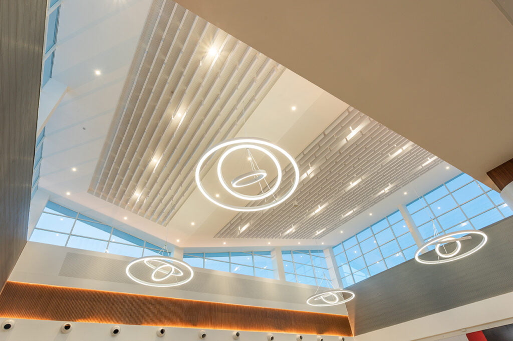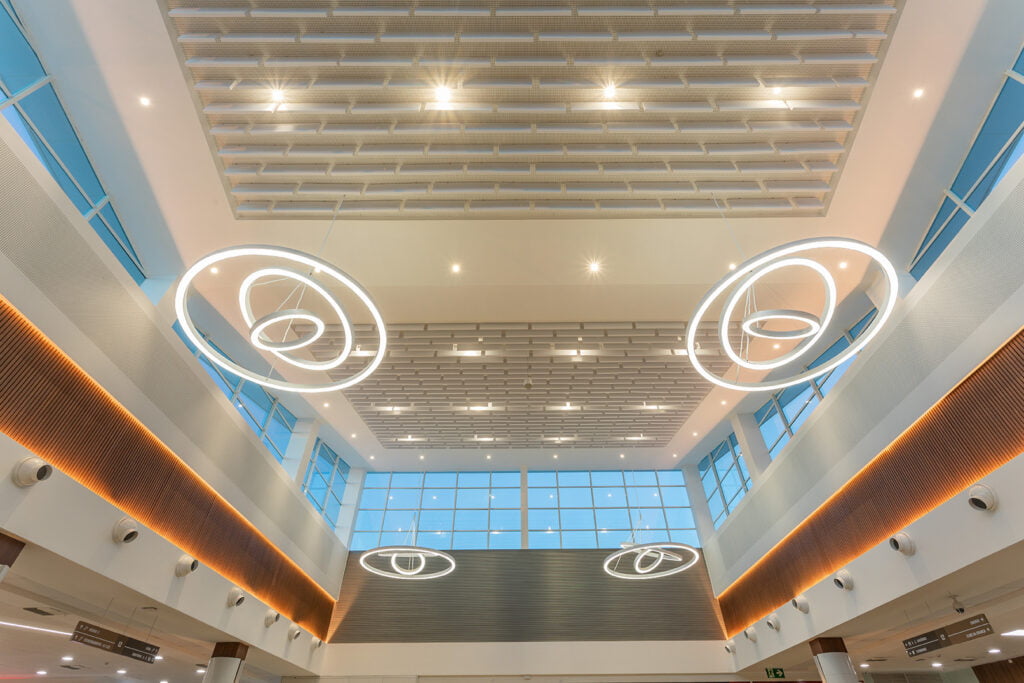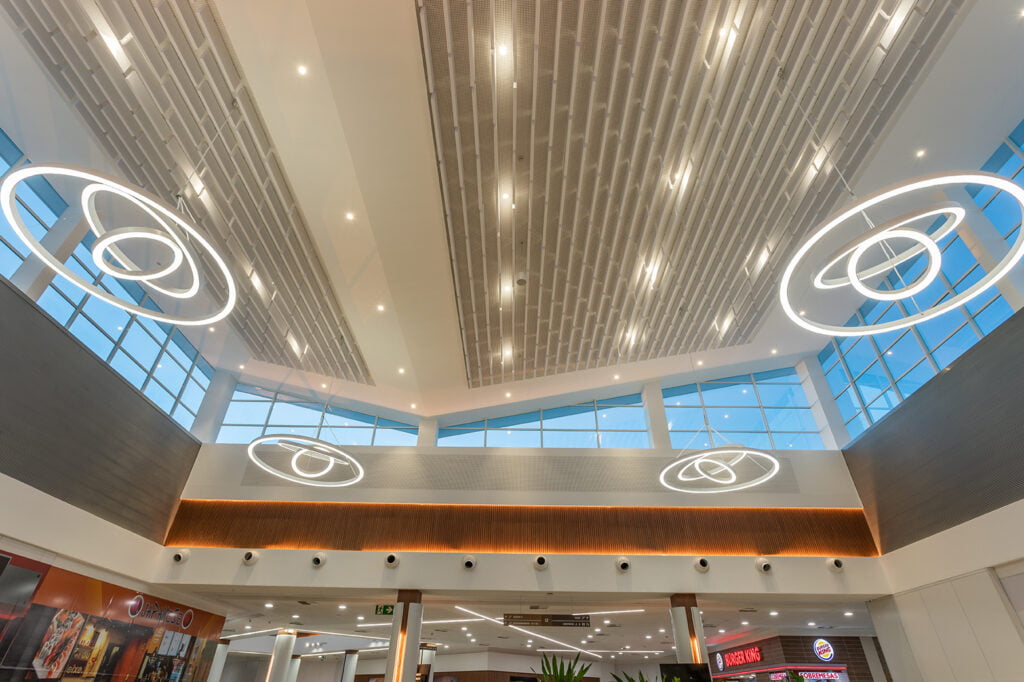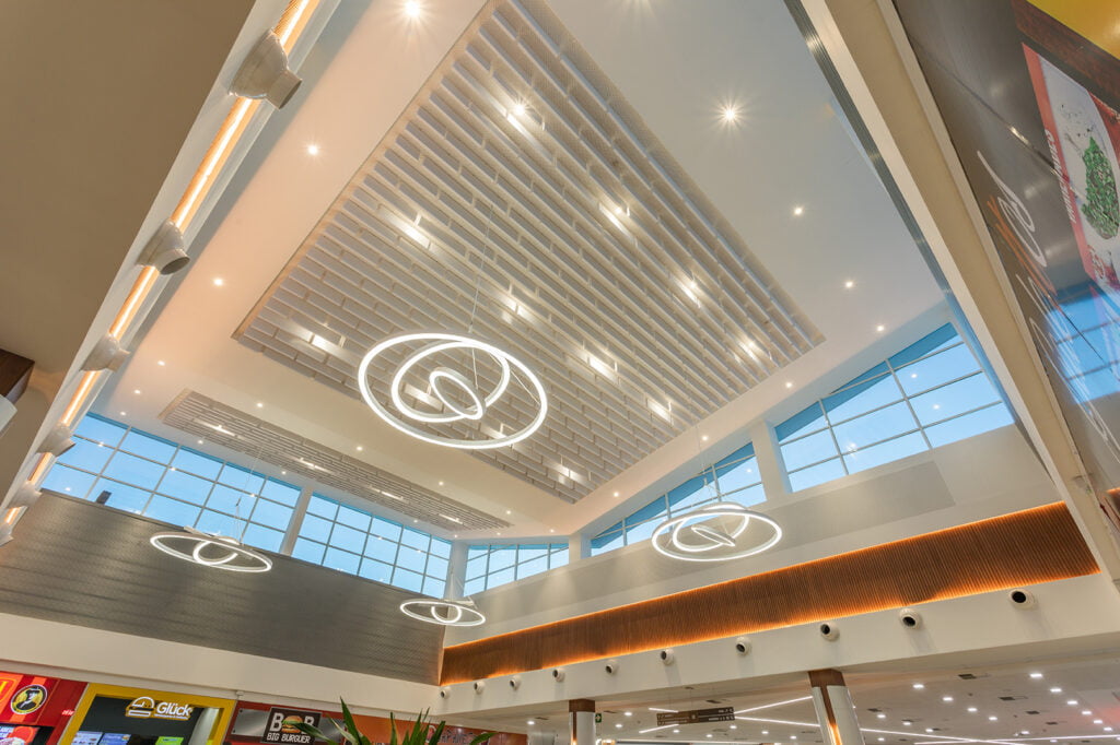 Pendant Luminaires formed by circular structures produced with Tensoflex aluminum profile, electrostatic painting, translucent films and perimetral LED strips.